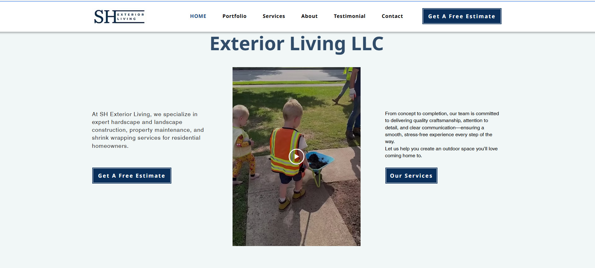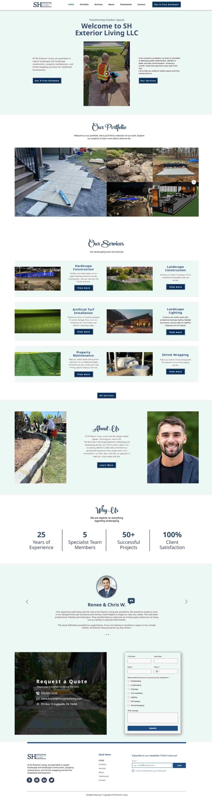 Welcome to SH Exterior Living’s Wix-powered showcase—a clean, visually appealing site that beautifully presents their expertise in transforming outdoor environments. The homepage seamlessly highlights key services like hardscape and landscape construction, artificial turf installation, lighting, maintenance, and shrink-wrapping, all underscored by crisp images and clear “View more” prompts. With a compelling “Get a Free Estimate” call-to-action up top, impactful project highlights in the portfolio section, and a standout testimonial praising their craftsmanship and professionalism, the site builds credibility while guiding visitors toward a smooth, client-centered experience.